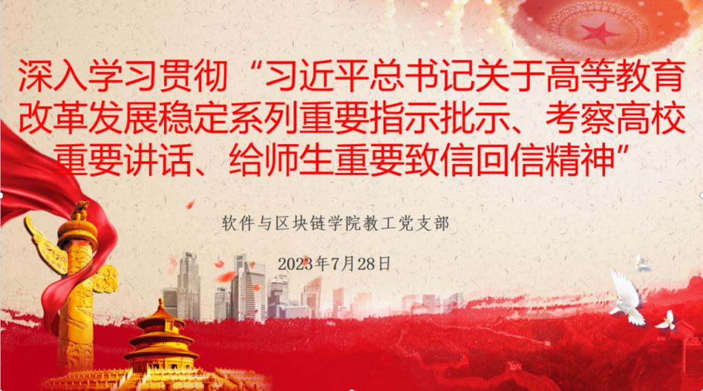 7月28日下午,软件与区块链学院教工党支部通过线上腾讯会议形式召开学习会议,会议内容围绕深入学习贯彻“习近平总书记关于高等教育改革发展稳定系列重要指示批示、考察高校重要讲话、给师生重要致信回信精神”展开,进一步坚守为党育人、为国育才的初心使命,会议由教工党支部书记卞秀运主持学习,全体教职工参加此次会议。