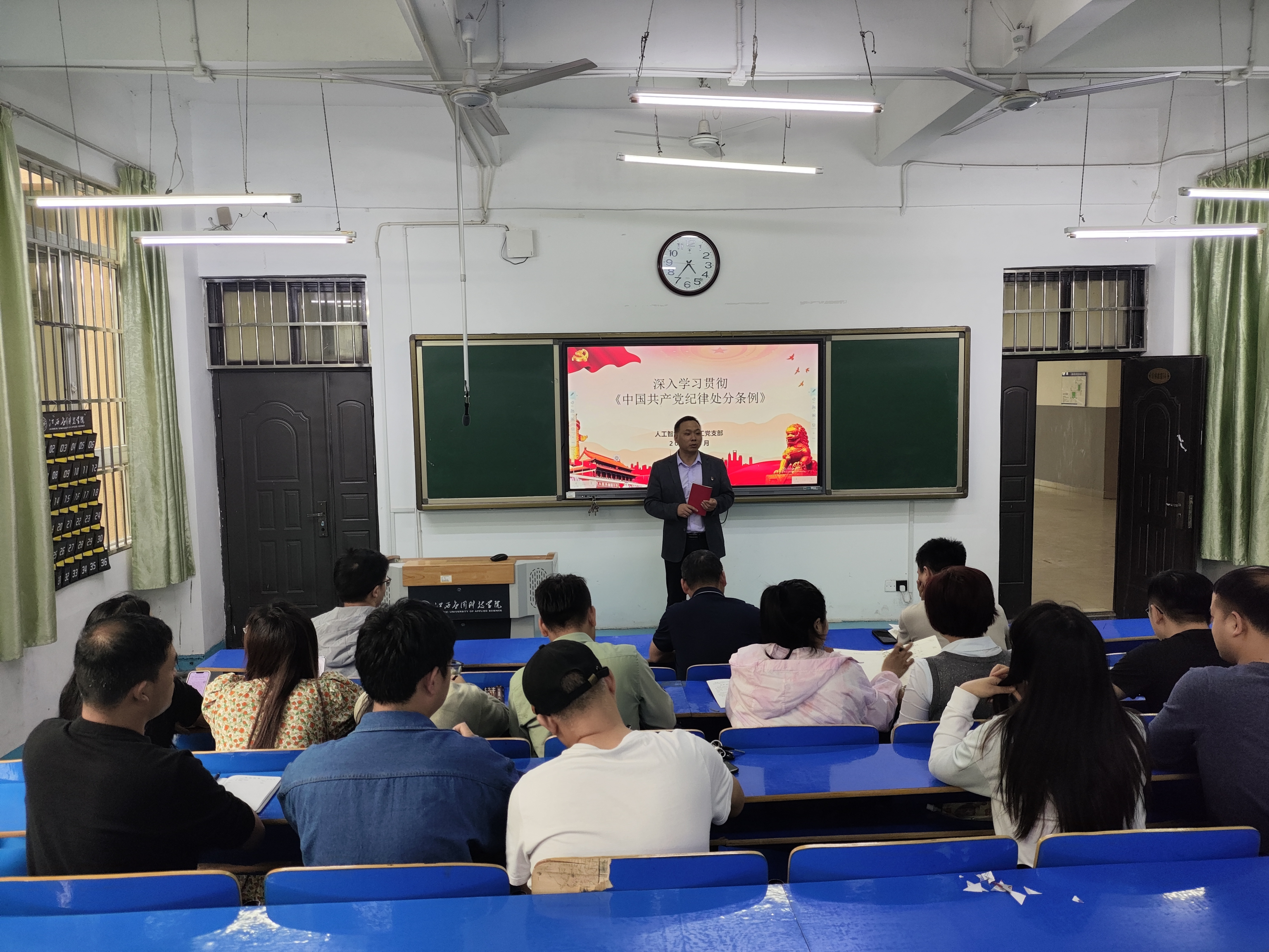 为进一步深化党纪学习教育和加强党风廉政建设,确保教师党员严明党的纪律、遵守党的规矩。2024年5月7日,人工智能学院教工党支部在三达楼阶梯九教室组织开展了专题学习会,深入学习贯彻《中国共产党纪律处分条例》(以下简称《条例》)的第三章“纪律处分运用规则”和第四章“对违法犯罪党员的纪律处分”。此次学习会由人工智能学院教工党支部书记徐洪敏主持,全体教师党员参加。