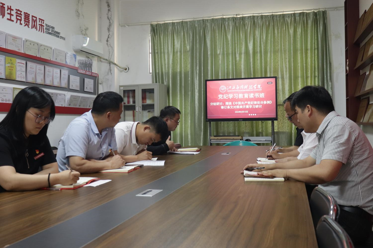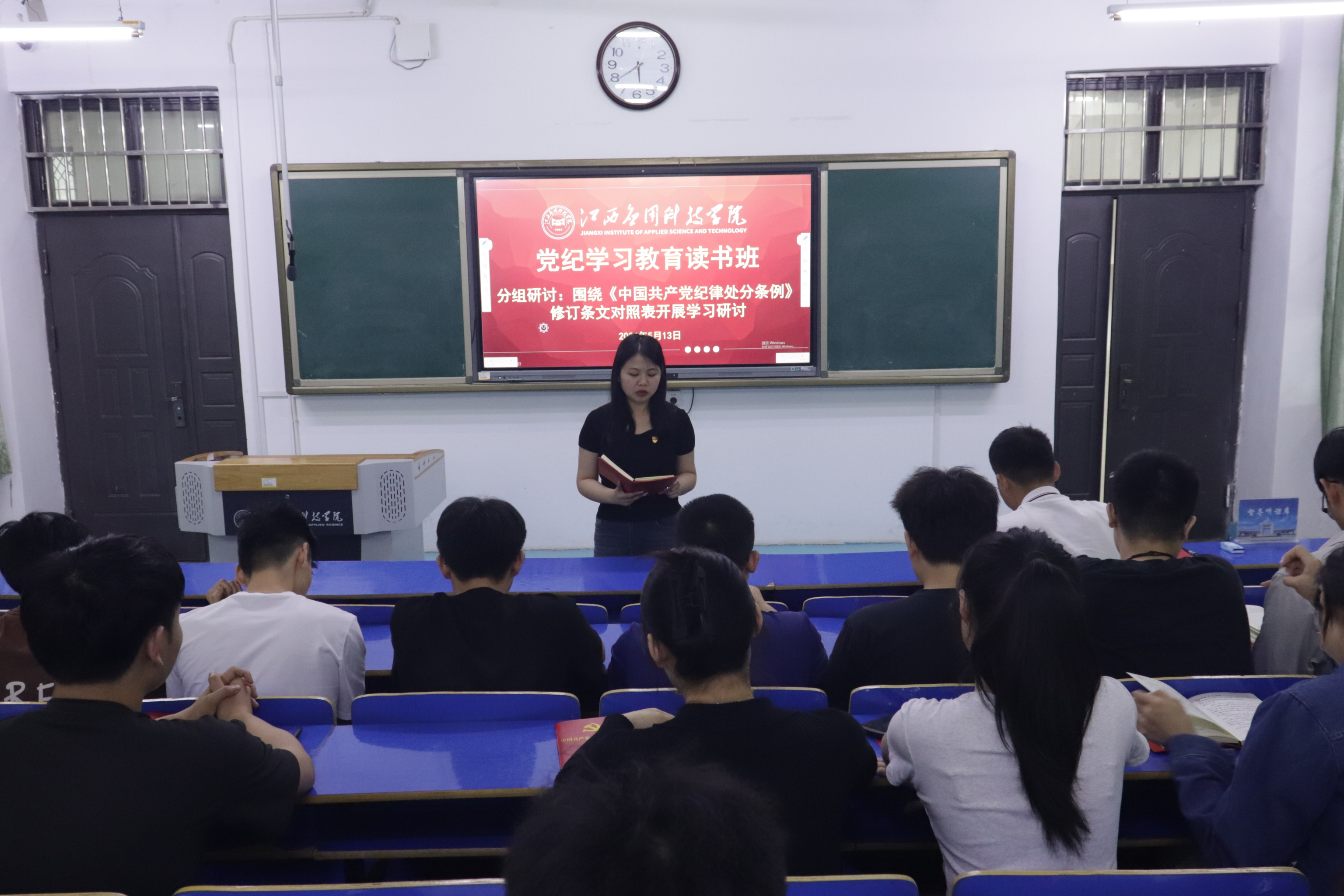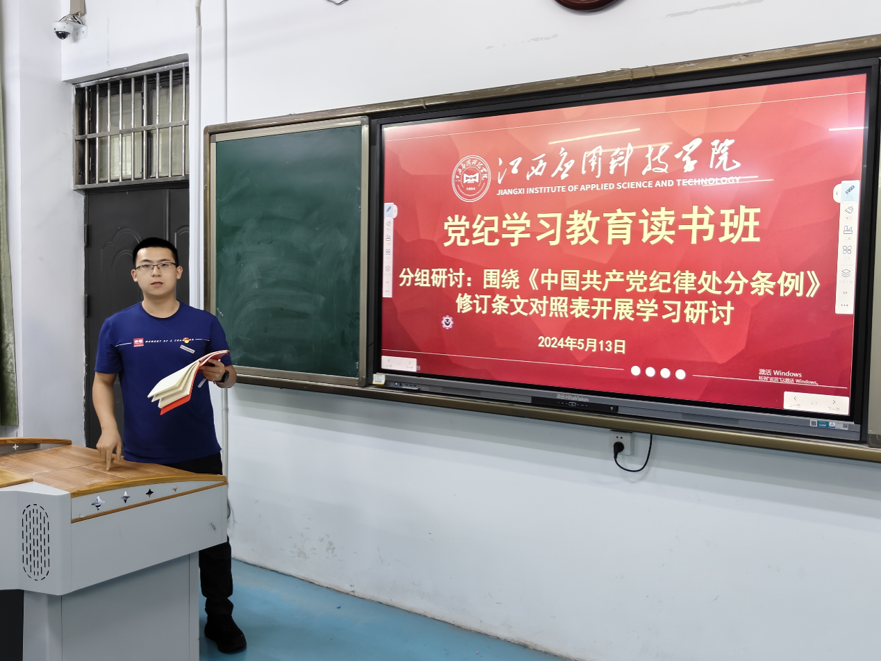 根据学校党纪学习教育读书班的日程安排,5月13日下午,人工智能学院党总支组织全体党员开展《中国共产党纪律处分条例》修订条文对照表学习研讨会,会议由党总支副书记贾鹏军主持,学院党总支成员、教工支部、学生支部分组开展了研讨。