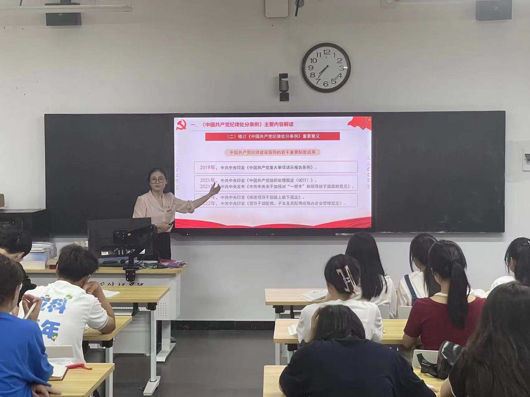 5月9日,建筑工程学院分党校在劲松楼204开展以“为新征程推进全面从严治党提供坚强纪律保障——聚焦《中国共产党纪律处分条例》要点学习”为主题的党纪学习教育党课。由马克思主义学院专职教师汪泽民主讲。