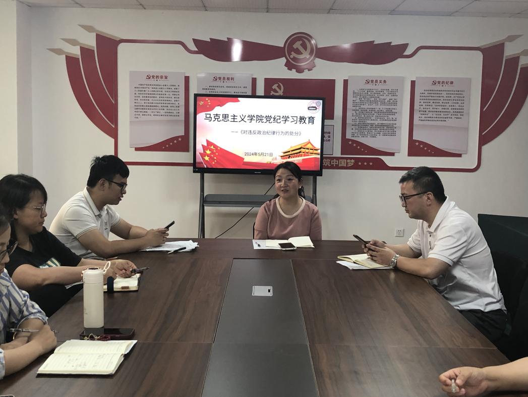 为进一步深入学习贯彻《中国共产党纪律处分条例》,5月21日,马克思主义学院全体党员思政课教师学习了《中国共产党纪律处分条例》中关于对违反政治纪律行为的处分。