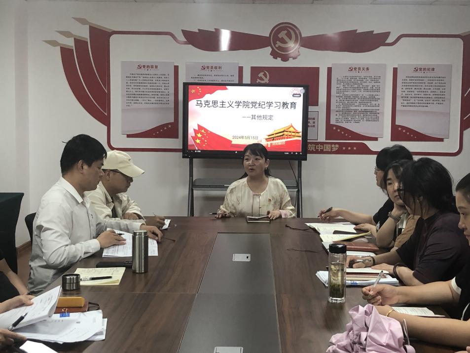 为深入贯彻习近平总书记关于党纪学习教育的重要讲话、重要指示精神,增强思政课教师党规党纪意识,5月15日,马克思主义学院全体思政课教师学习了《中国共产党纪律处分条例》中关于其他规定。