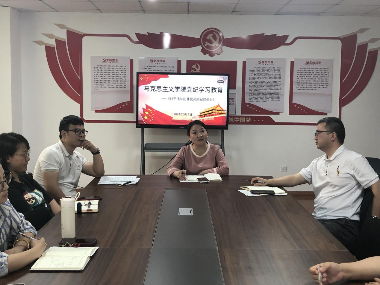 为深入开展党纪学习教育,5月7日,马克思主义学院全体思政课教师学习了《中国共产党纪律处分条例》中关于对于违法犯罪党员的纪律处分,推动党纪学习教育入脑入心,引导党员同志做到学纪、知纪、明纪、守纪。