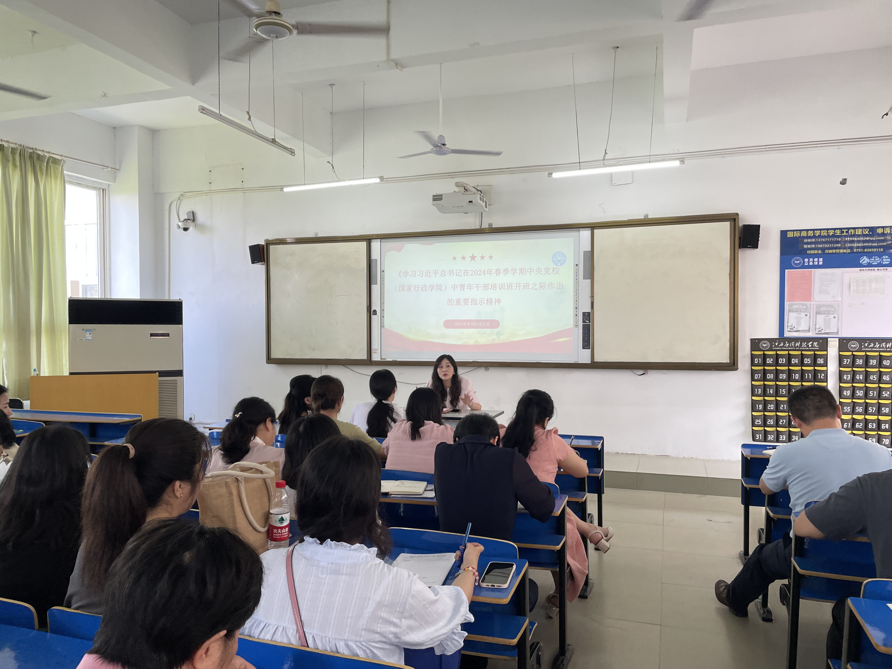 为深刻学习领会习近平总书记重要讲话精神的重大意义、丰富内涵和实践要求,国际商务学院党总支于2024年6月11日,在三达楼204教室召开学习习近平总书记在2024年春季学期中央党校(国家行政学院)中青年干部培训班开班之际作出的重要指示精神学习会,全体教师党员参与本次学习会。此次学习会由党总支专职组织员吴梦晶主持,党总支宣传委员钟露记录。